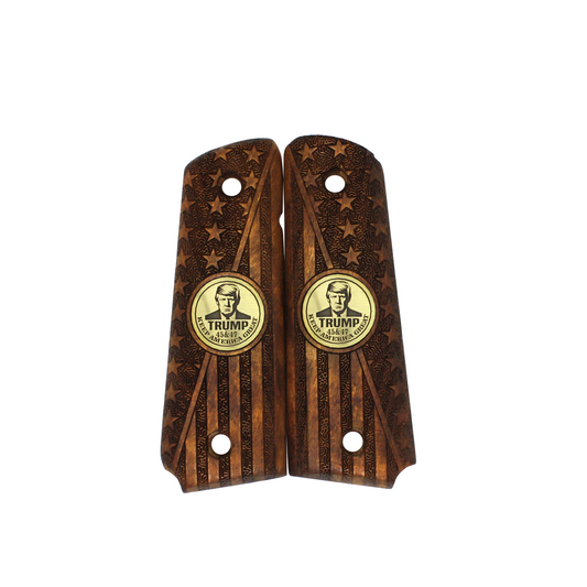 URAY 1911 Empuñaduras de pistola de madera con medallón y bandera de 45 Trump, híbrido hecho a mano/CNC de tamaño completo
